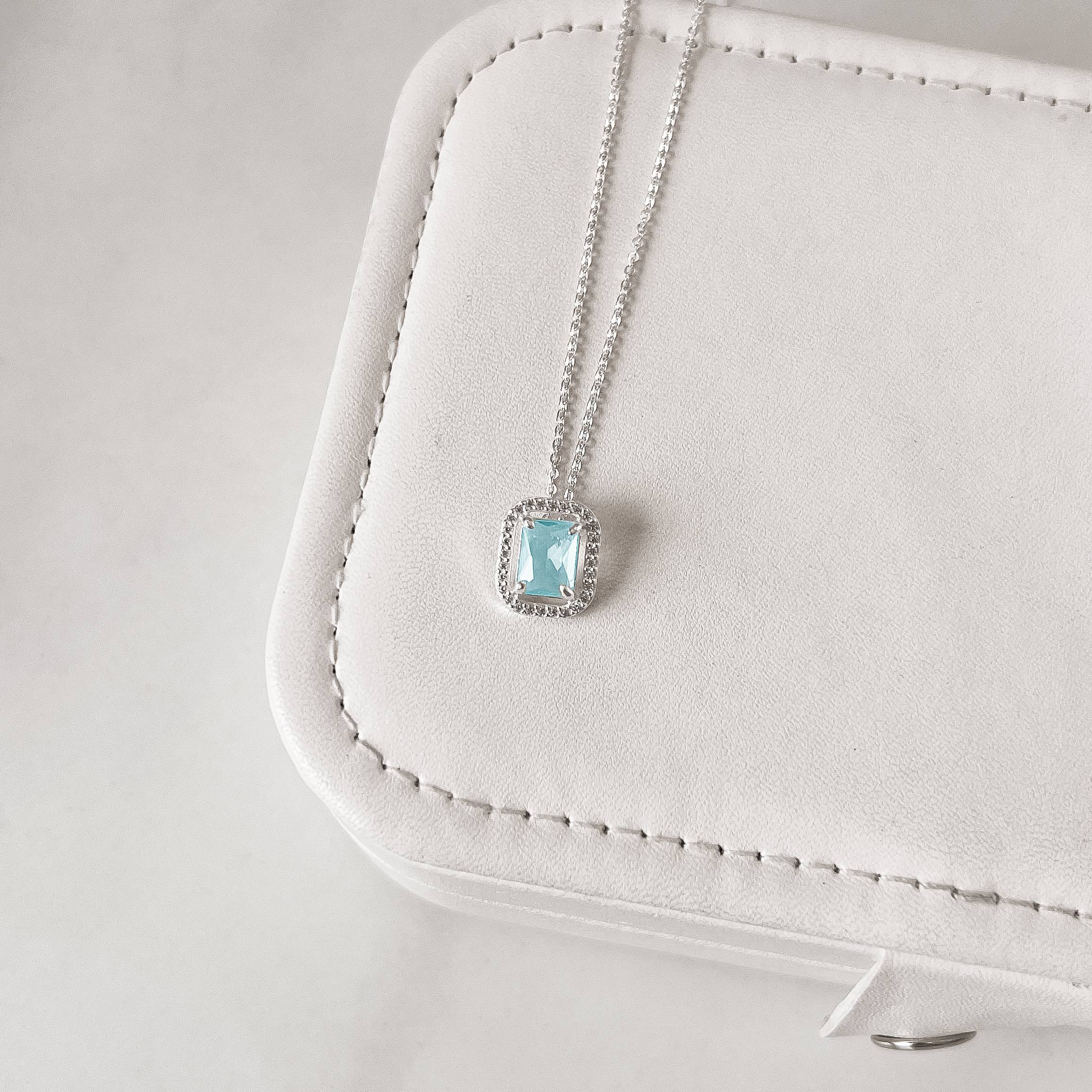 Colar zircônia retangular azul claro com cravejado 13mm corrente cadeadinho 45cm
