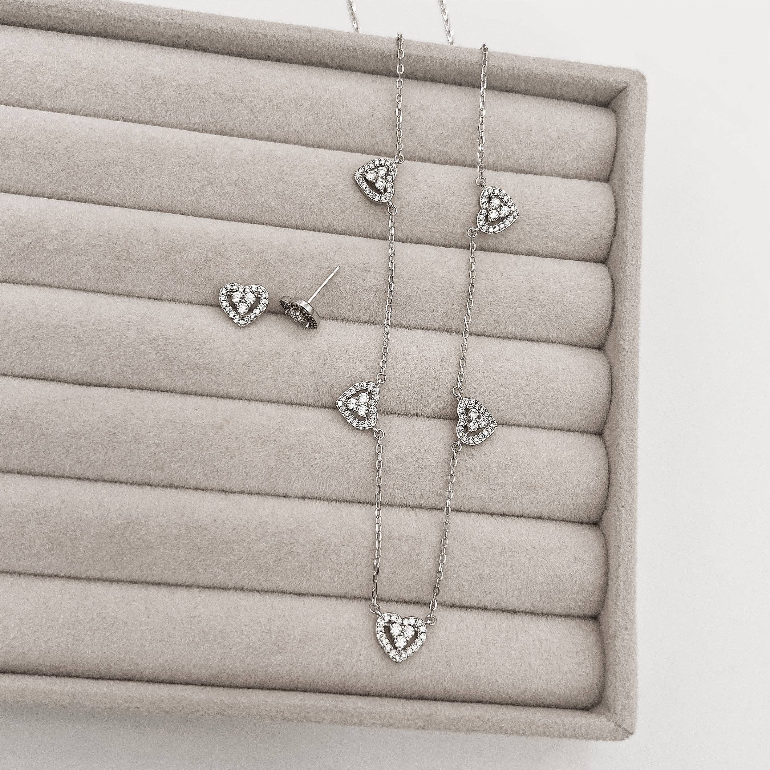 Conjunto brinco e colar entremeio corações vazados cravejados 9mm ródio 40+5cm